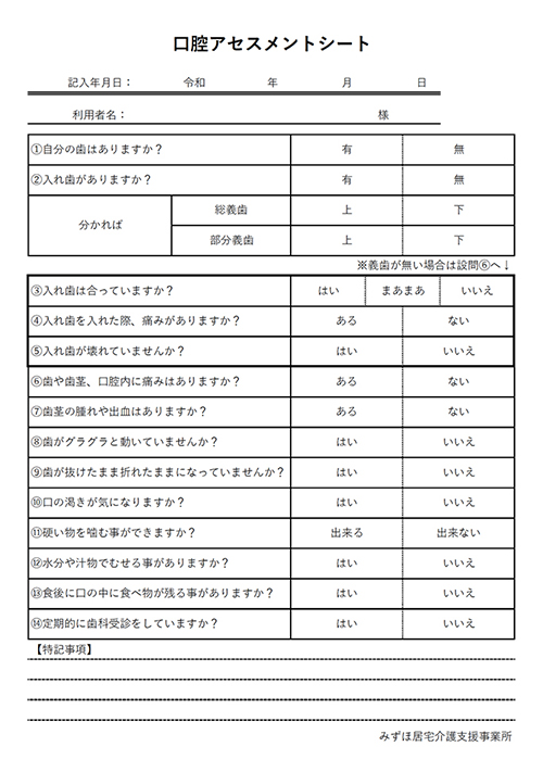 歯科診療の必要可否が判断できるように、当居宅介護支援事業所独自の様式として、歯科医師や歯科衛生士からのアドバイスのもと口腔ケアアセスメントシートを作成し活用しています。